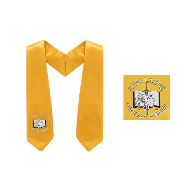 Solid Color Satin Honor Stole with Cum Laude printed on the left side of person wearing. Length : Approximately 36" inches on each side. Colors: Gold
