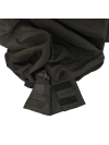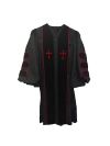 Fabric: 100% Woven Polyester with Black Velvet Stripes on sleeves and down the font of the gown and on the sleeves with Red Piping. (See picture for velvet stripe placement)